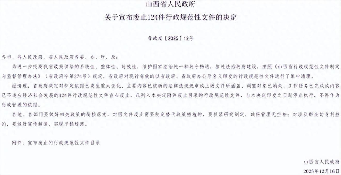近日,山西省人民政府网发布关于宣布废止124件行政规范性文件的决定,决定表示,经清理,省政府决定对制定依据已发生重大变化、主要内容已被新的法律法规规章或上级文件所涵盖、调整对象已消失、工作任务已完成或内容已不适应经济社会发展的124件行政规范性文件宣布废止。凡列入本决定附件废止目录的行政规范性文件,自本决定印发之日起停止执行,不再作为行政管理的依据。
