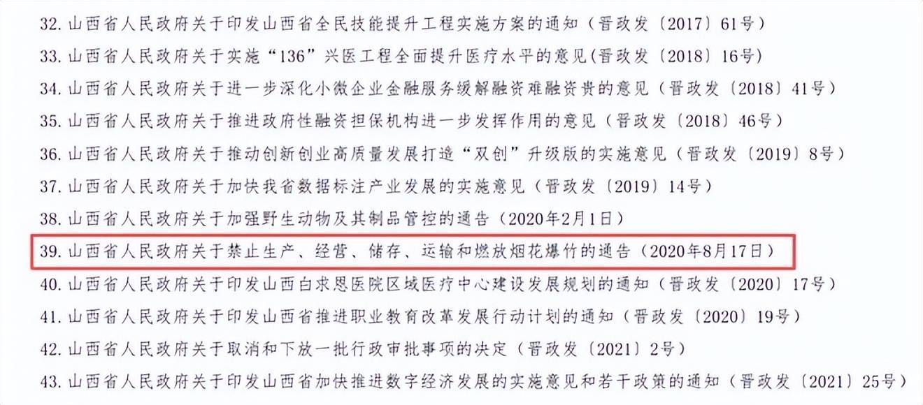 在公布的文件目录中,2020年8月17日发布的《山西省关于禁止生产、经营、储存、运输和燃放烟花爆竹的通告》也被宣布废止。