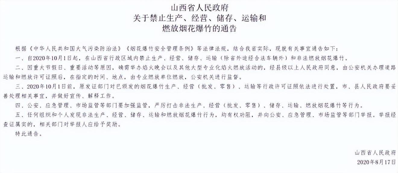 该通告当时表示,自2020年10月1日起,在山西省行政区域内禁止生产、经营、储存、运输(除省外途经合法车辆外)和非法燃放烟花爆竹,因重大节假日、重要活动等原因,确需举办焰火晚会以及其他大型专业化焰火燃放活动的,经县级以上人民政府同意,由公安机关办理道路运输和燃放许可证照后,在指定的时间、地点,由专业燃放单位燃放,公安机关进行监督。